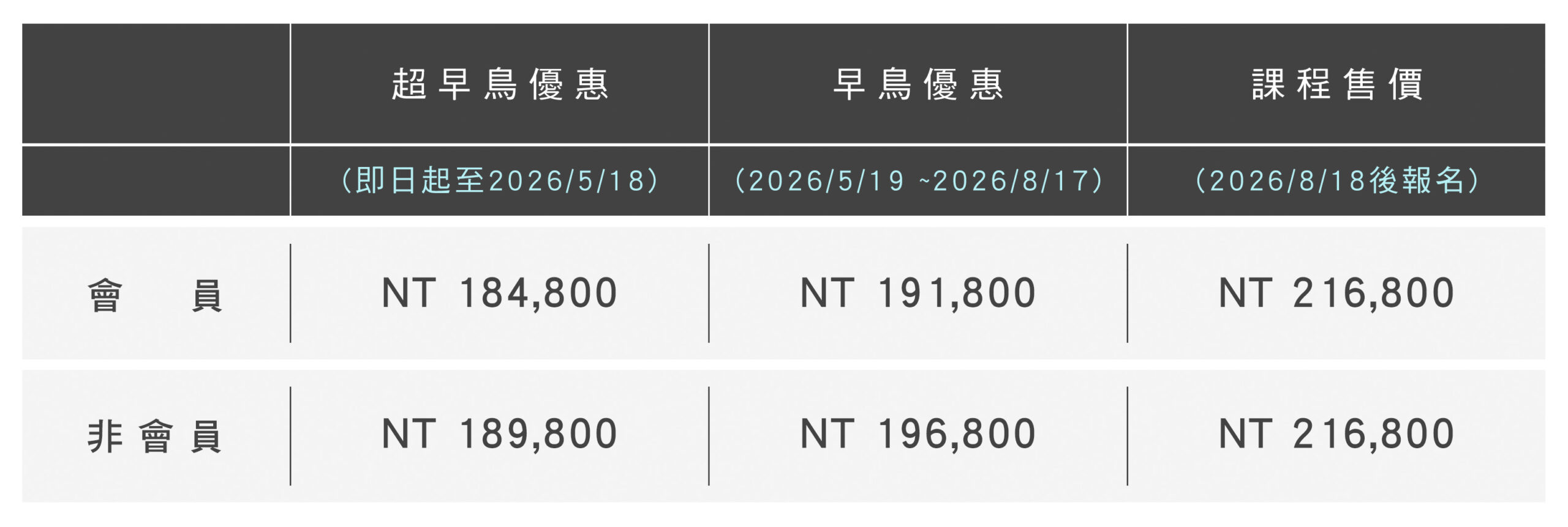 | 2026/8/17早鳥前報名 | 2026/8/18後 | ||