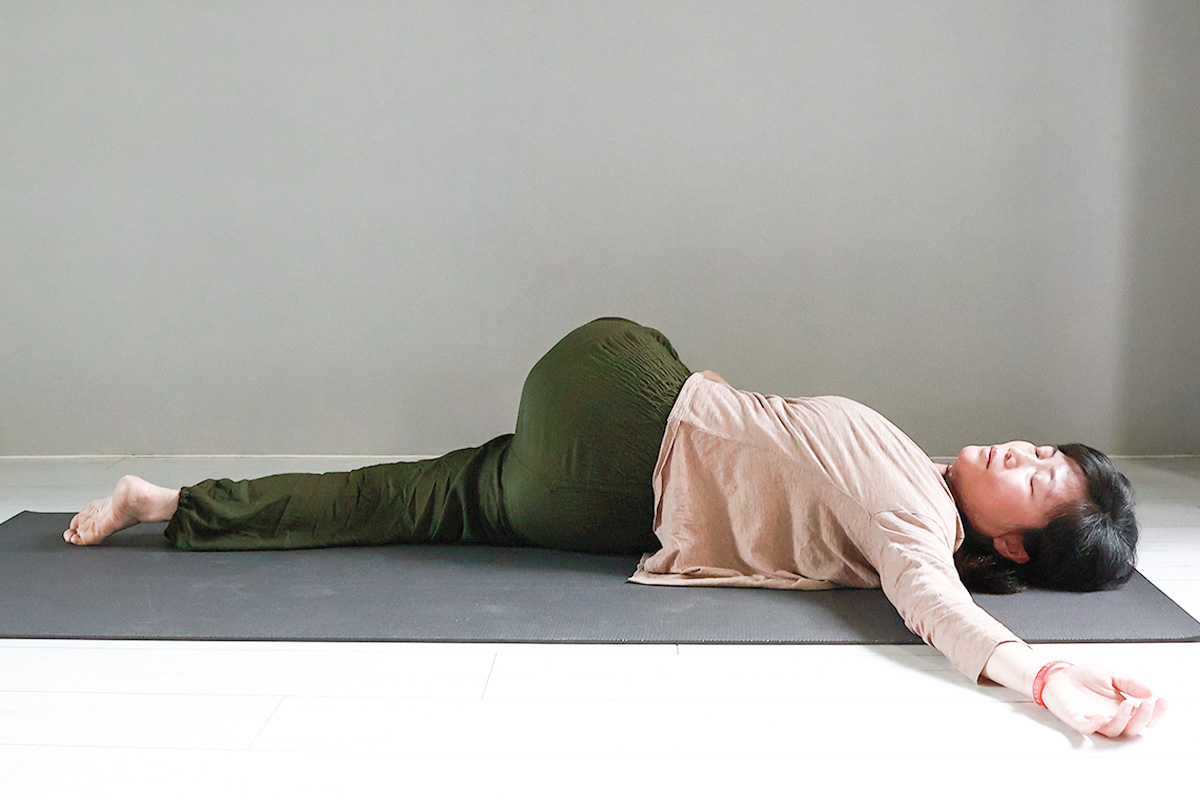 開啟髖部與胸腔,配合抱枕支撐脊椎。姿勢能擴張呼吸空間,增加橫膈膜活動範圍,幫助身體在不費力情況下進行深度氣體交換,釋放積聚在軀幹核心的熱氣,達到開髖散熱的效果。